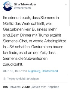 Dann war Joe Kaeser, seines Zeichens Vorstandsvorsitzender von Siemens, in Davos mit Trump beim dinieren. Dort verriet er dem US-Präsidenten, dass sein Konzern sich stark in den USA engagieren werde. Arbeitsplätze schaffen. Turbinen bauen. Mit diesem Moment wußte ich: „Einst gehörte Siemens zur Familie. Heute zerstört es Familien!“