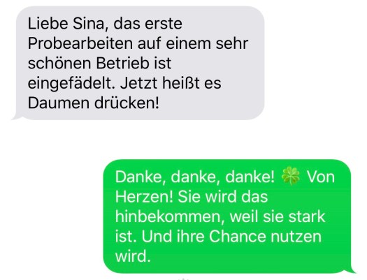 Die junge, wohnungslose Mutter ging mir nicht aus dem Kopf. Sie erzählte mir, dass sie sogar den besten Abschluss in ihrer Ausbildung hingelegt hatte. Gärtnerin im Gemüsebau. Aber, sie würde auch gerne nähen lernen. „Einen Einser-Abschluss im Traumjob und dann keine Chance bekommen“, dachte ich mir. Das wollte ich verdammte hacke nochmal nicht akzeptieren. Ich griff zum Telefonhörer und nach ein paar Gesprächen erhielt ich folgende SMS: